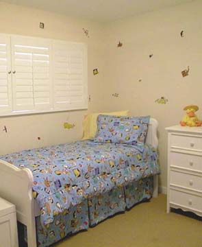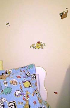 This little girls room has happy animals dancing around the walls. The soft beige background is the perfect color to maintain sophistication in this zoo.