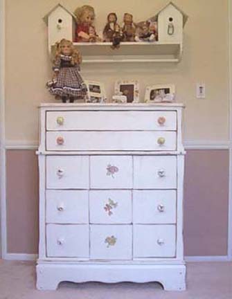 We gave this dresser a lot of it by doing a color wash on some of the knobs, and by painting flowers and berries on the center panels.
